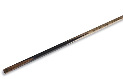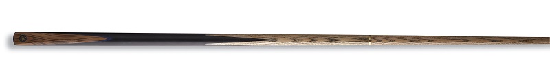 Dieses halbgeteilte 57-Zoll-Queue hat einen Schaft aus Esche mit Griff aus Ebenholzimitat, der maschinell gespleißt wurde und mit einem Frontspleiß aus echtem Zebrawood und blauem Furnier verziert ist.