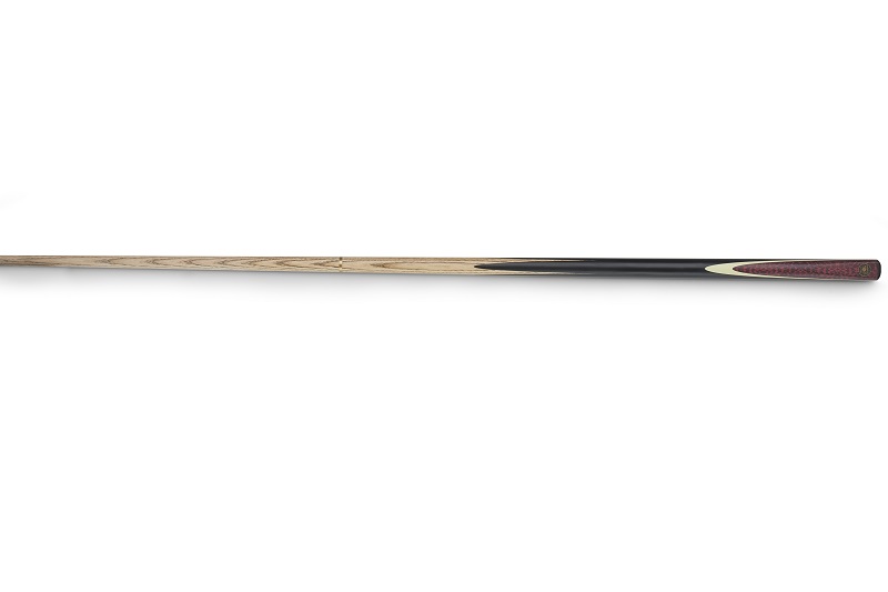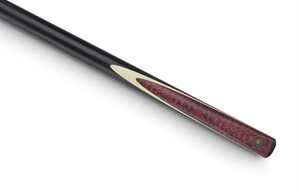 Dieses halbgeteilte 57-Zoll-Queue hat einen Schaft aus Esche mit Griff aus Ebenholzimitat, der handgespleißt und mit Furnieraufklebern in Schlangenholz- und weißer Furnier-Optik verziert ist. (Aufkleber sind nicht spürbar)