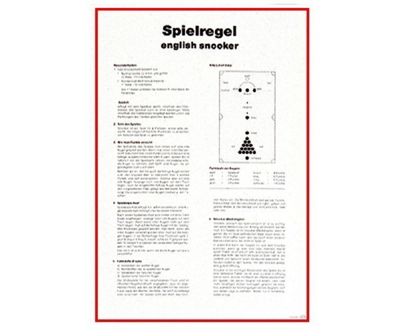 Plakat auf Karton mit Aufhänger mit den Snooker-Regeln auf Deutsch.